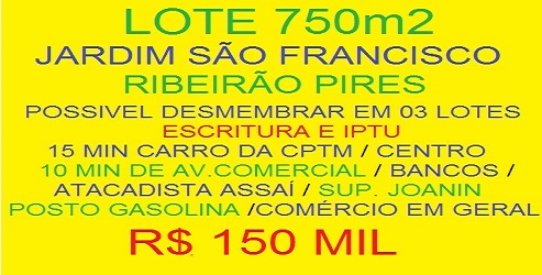Terreno 760m2 16m de frente Jardim São Francisco Ribeirão Pires topografia em aclive uso de solo de 80% possivel desmembrar em 03 lotes Documentado Escritura e Iptu próx. de linha de ônibus escola Valor R$ 150 Mil maiores informações genivaldo batista corretor creci 42.075F 971254257 vivo / whatssap