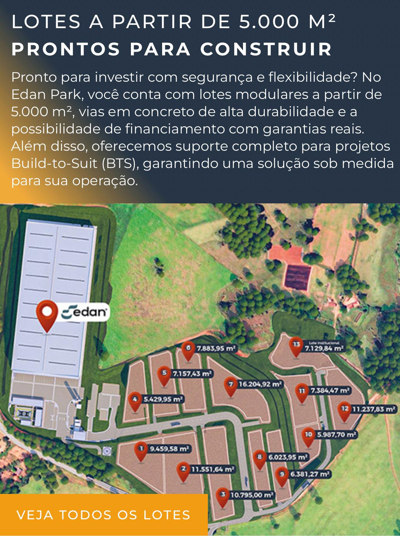 Loteamento industrial estrategicamente planejado para atender empresas que buscam expansão, infraestrutura moderna e um ambiente seguro para seus investimentos. Com lotes a partir de 5.000 m² e localização privilegiada, o empreendimento oferece soluções completas para negócios que necessitam de uma base sólida para crescer. Energia Elétrica: Infraestrutura elétrica disponível até o loteamento. A solicitação de demanda específica deve ser feita diretamente à concessionária, com suporte técnico da MMJ Consulting. Água e Esgoto: Abastecimento garantido e sistema de esgoto com fossas sépticas individuais por conta de cada lote, mediante aprovação de projeto pelos órgãos competentes. Internet e Telefonia: Conectividade de alta velocidade com fibra óptica já disponível no local. Pavimentação e Drenagem: Vias de acesso em pavimento de concreto, projetadas para suportar tráfego pesado. Sistema de drenagem eficiente, conduzindo a água pluvial para tanques de retardo. Iluminação Pública: Infraestrutura de iluminação instalada em todo o loteamento. Coleta de Resíduos: Coleta de resíduo doméstico a ser realizado pela prefeitura. Zoneamento Flexível: Sem restrições para atividades fabris, sujeito a análise das leis municipais. Matrícula Individual: Todos os lotes possuem documentação regularizada, permitindo financiamento bancário. Regras do Loteamento: Não há restrições específicas de construção, devendo ser observadas as normas municipais. Acessibilidade: Ruas internas projetadas com padrão de rodovias , garantindo suporte ao tráfego de caminhões e carretas. Proximidade Estratégica: Conectado a importantes centros urbanos e polos industriais. Transporte de Cargas: Estrutura viária robusta para suportar operações logísticas de grande porte. Sem Taxas de Condomínio: Loteamento aberto, com possibilidade futura de criação de uma associação. Entrega de Infraestruturas: Obras em andamento, com previsão de conclusão em aproximadamente 6 meses (a partir de Abril/2025) Incentivos Fiscais: Programa de benefícios municipais em aprovação, incluindo facilitação para obtenção de isenção de IPTU e outros incentivos. Programas Estaduais: Empresas podem se beneficiar do programa Invest Minas para incentivos ao desenvolvimento industrial. Terreno preparado com aterro controlado e compactação de 100% PN, reduzindo custos com fundação; Pavimentação inovadora em concreto TCP, tecnologia importada que oferece durabilidade superior e resistência ao tráfego pesado; Localização elevada, garantindo zero risco de alagamento; Empresa âncora já instalada: A EDAN, referência no setor de decoração Início das obras da EDAN em abril. Previsão de Outubro/25 para conclusão da obra de infraestrutura para receber novas empresas. Podendo começar a construção da empresa antes