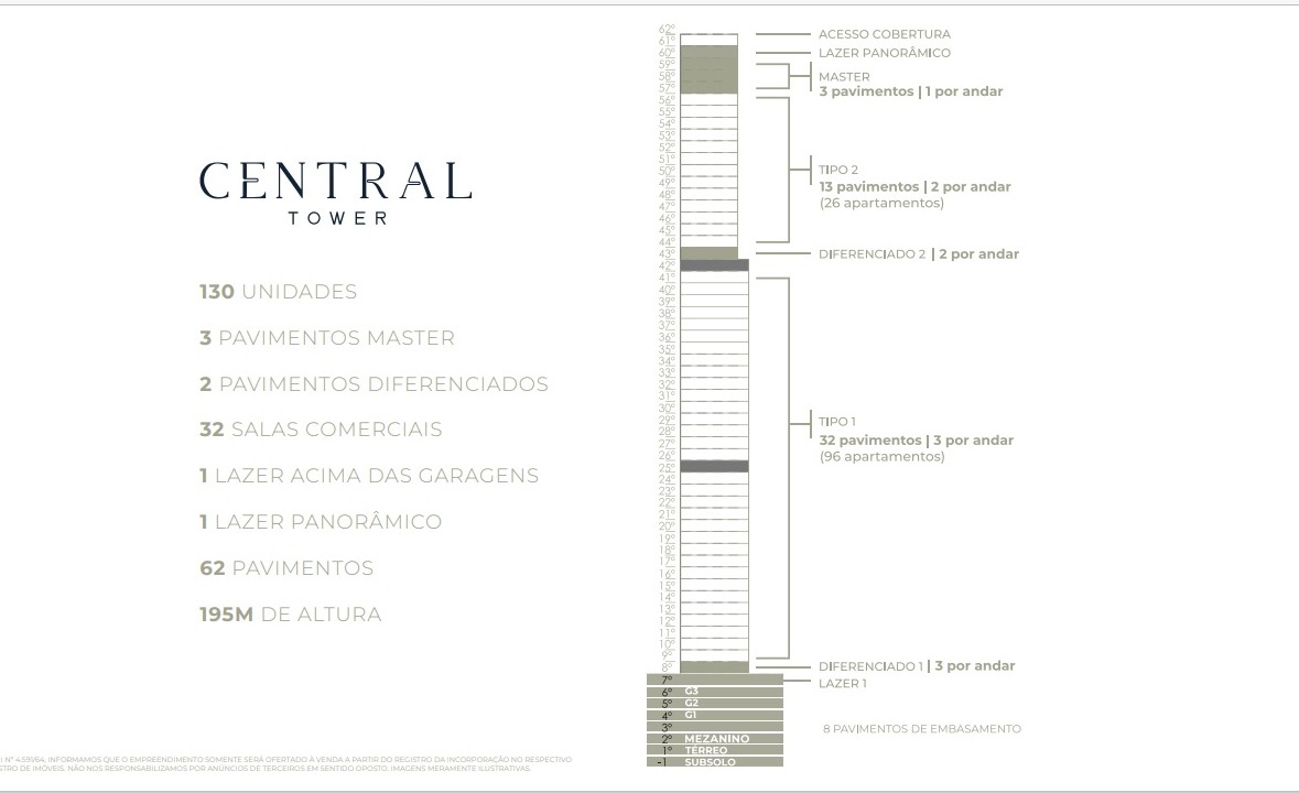R$ 6.413.000,00 Unidade 4701 Previsão de entrega: 2031 Central Tower uma estrutura completa para quem quer viver com conforto e harmonia Apartamento de alto padrão em uma localização privilegiada 189.61 m² área privativa 365.59 m² área total 4 dormitórios/suítes 3 vagas de garagem 47° pavimento Empreendimento: 1 torre 62 pavimentos 195 metros de altura 130 apartamentos no total 3 apartamento por andar (8° ao 42° pavimento) 2 apartamentos por andar (43° ao 56° pavimento) 1 apartamento por andar (57° ao 59° pavimento) Bar piscina Brinquedoteca Empório Espaço beauty Gourmet Piscina Playground Quadra poliesportiva Sala de massagem Salão de festas Sauna úmida Spa Quiosque Sala de jogos Academia Pub panorâmico Localização: Avenida Central, Balneário Camboriú/Sc Valores sujeitos a alterações sem aviso prévio