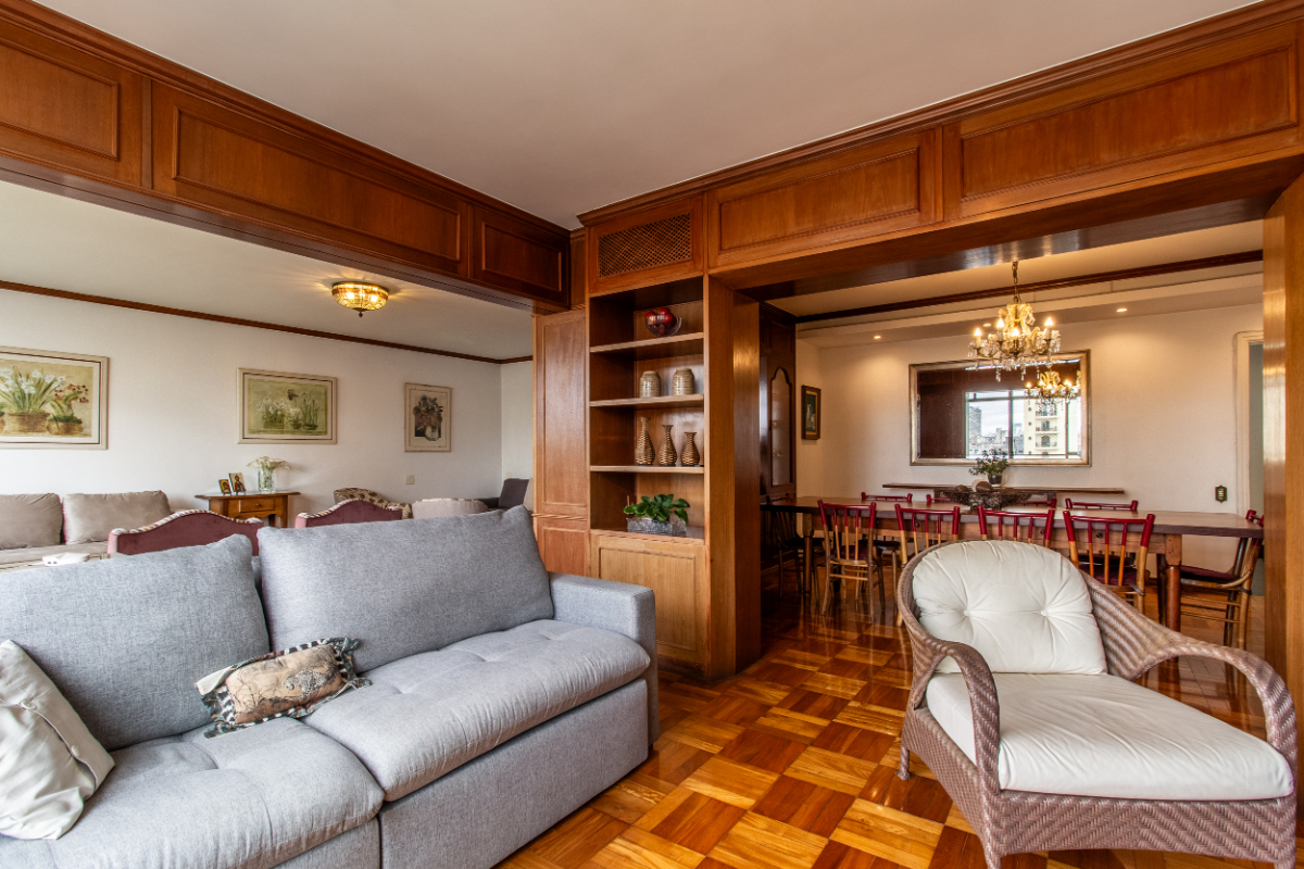 Apartamento com living para 2 ambientes, lavabo, 4 amplos dormitórios com armários embutidos (sendo dois com sacada fechada), escritório com armários, 2 banheiros sociais, copa com armários, cozinha planejada, ampla área de serviço e dependência de empregada. OBS: Planta original com 4 dormitórios, proprietário abriu 1 para ampliar o living.