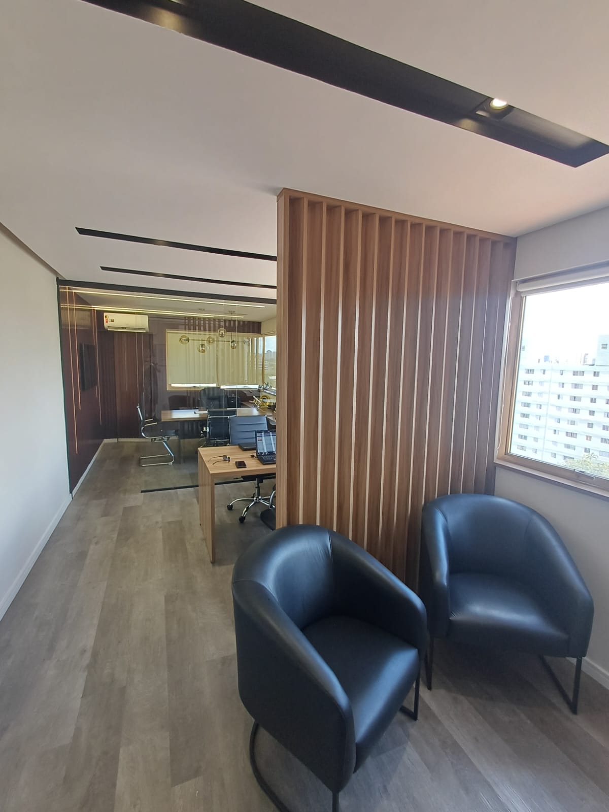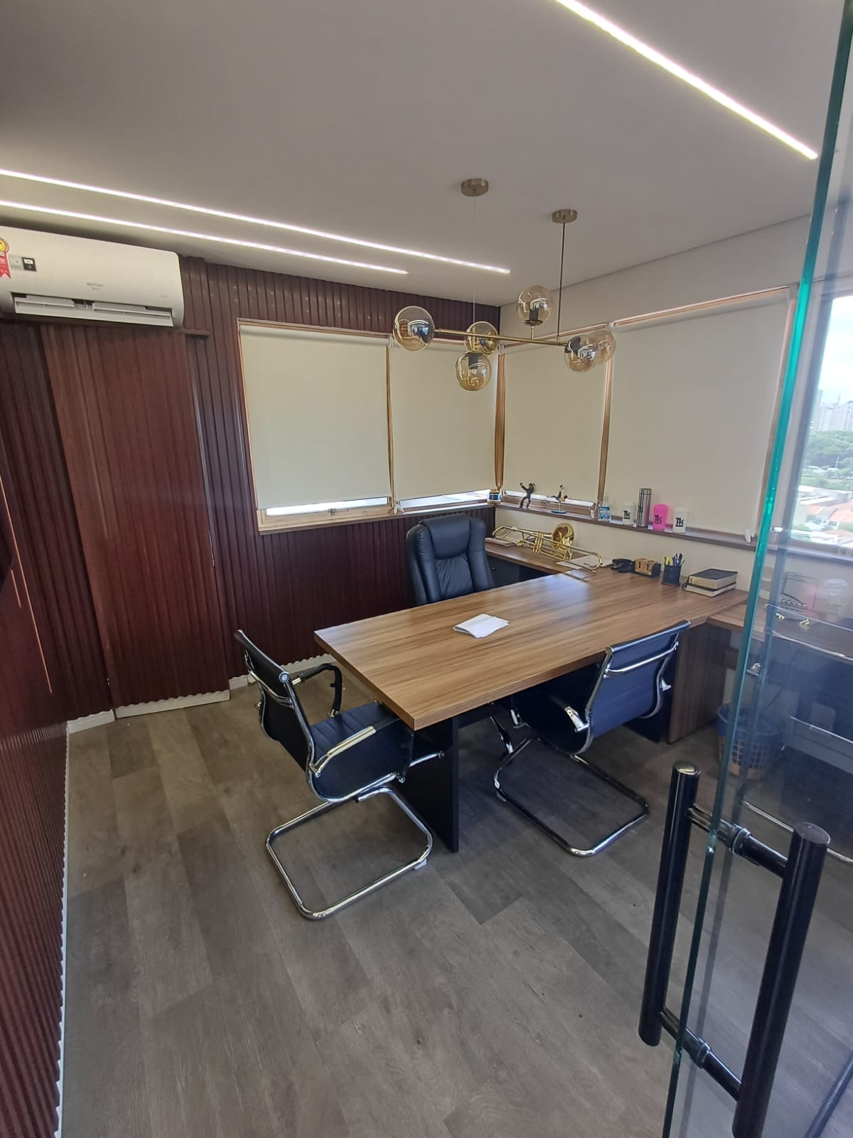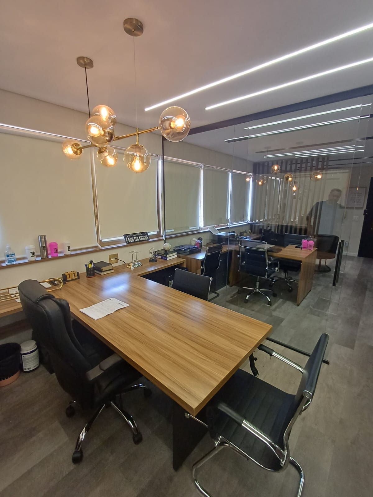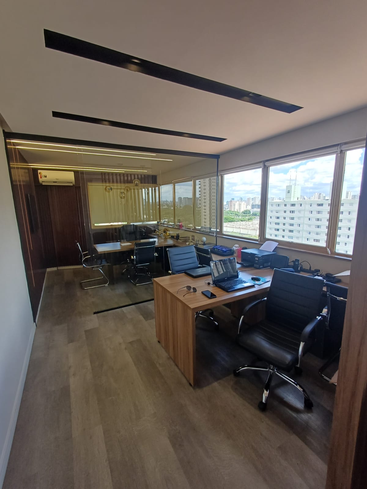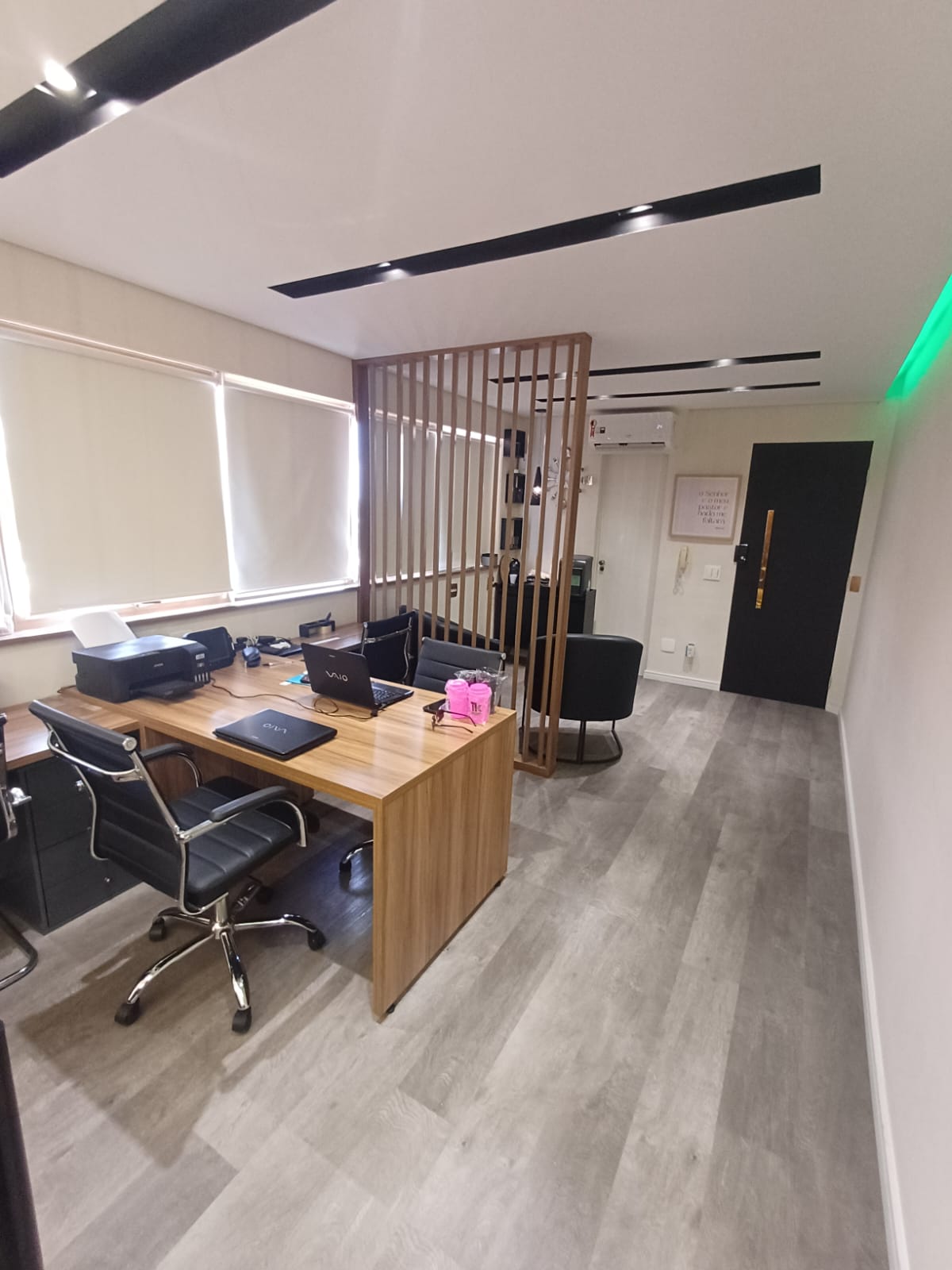 Este sala comercial apresenta 2 banheiros e 1 vaga de garagem. Com área total de 30m². fino acabamento. com armarios e mesas planejadas, 7 cadeiras, 2 poltronas, divisao em vidro.
