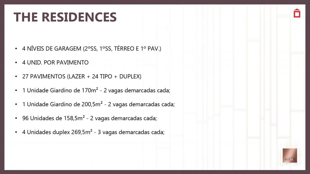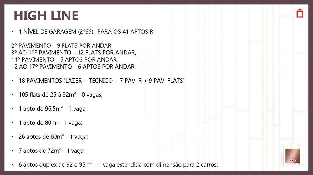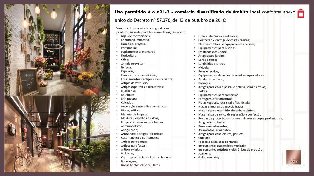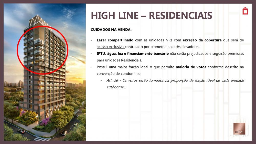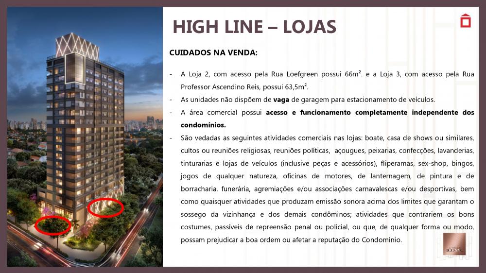 R$ 13.000,00 por metros quadrados uma oportunidade para se morar bem ICONYC: exclusividade para pessoas exclusiva de bom gosto LOCALIZAÇÃO: privilegiada, fundamental no cotidiano otimizando tempo com a tranquilidade da moderna mobilidade urbana PROJETO: idealizado com excelência para pessoas excelente. CURADORIA: pensado em atender a expectativa do cidadão globalizado. TRANSPARÊNCIA: segurança e plenitude da região PERSONALIDADE: valorizando o bijetivo de morar bem mmmmmmmmmmmmmmmmmmmmmmmmmmmmmmmmmmmmmmmmmmmmmmmmmmmmmmmmmmmmmmmmmmmmmm HIGH LINE – RESIDENCIAIS CUIDADOS NA VENDA: - Lazer compartilhado com as unidades NRs com exceção da cobertura que será de acesso exclusivo controlado por biometria nos três elevadores. - IPTU, água, luz e financiamento bancário não serão prejudicados e seguirão premissas para unidades Residenciais. - Possui uma maior fração ideal o que permite maioria de votos conforme descrito na convenção de condomínio: - Art. 26 - Os votos serão tomados na proporção da fração ideal de cada unidade autônoma... mmmmmmmmmmmmmmmmmmmmmmmmmmmmmmmmmmmmmmmmmmmmmmmmmmmmmmmmmmmmmmmmmmmmmm A Loja 2, com acesso pela Rua Loefgreen possui 66 m². e a Loja 3, com acesso pela Rua Professor Ascendino Reis, possui 63,5 m². - As unidades não dispõem de vaga de garagem para estacionamento de veículos. - A área comercial possui acesso e funcionamento completamente independente dos condomínios. - São vedadas as seguintes atividades comerciais nas lojas: boate, casa de shows ou similares, cultos ou reuniões religiosas, reuniões políticas, açougues, peixarias, confecções, lavanderias, tinturarias e lojas de veículos (inclusive peças e acessórios), fliperamas, sex-shop, bingos, jogos de qualquer natureza, oficinas de motores, de lanternagem, de pintura e de borracharia, funerária, agremiações e/ou associações carnavalescas e/ou desportivas, bem como quaisquer atividades que produzam emissão sonora acima dos limites que garantam o sossego da vizinhança e dos demais condôminos; atividades que contrariem os bons costumes, passíveis de repreensão penal ou policial, ou que, de qualquer forma ou modo, possam prejudicar a boa ordem ou afetar a reputação do Condomínio. mmmmmmmmmmmmmmmmmmmmmmmmmmmmmmmmmmmmmmmmmmmmmmmmmmmmmmmmmmmmmmmmm Uso permitido é o nR1-3 - comércio diversificado de âmbito local conforme anexo único do Decreto nº 57.378, de 13 de outubro de 2016: • Linhas telefônicas e celulares; • Confecção e entrega de cestas básicas; • Eletrodomésticos e equipamentos de som; • Equipamentos para piscinas; • Estofados e colchões; • Artigos para jardins; • Lonas e toldos; • Luminárias e lustres; • Móveis; • Peles e tecidos; • Equipamentos de ar condicionado e aquecedores; • Artefatos de metal; • Balanças; • Artigos para caça e pesca, cutelaria, selas e arreios; • Cofres; • Equipamentos para campismo; • Ferragens e ferramentas; • Fibras vegetais, juta, sisal e fios têxteis; • Mapas e impressos especializados; • Material para escritório, desenho e pintura; • Material para serviço de reparação e confecção; • Roupas de proteção, uniformes militares e roupas profissionais; • Artigos de cerâmica; • Pisos e revestimentos; • Aviamentos, armarinhos; • Artigos para cabeleireiros, perucas; • Cutelaria; • Preparados de usos dentários; • Instrumentos e acessórios musicais; • Instrumentos elétricos e eletrônicos de precisão; • Joalheria; • Galeria de arte; Varejista de mercadorias em geral, sem predominância de produtos alimentícios, tais como: • Lojas de conveniência; • Charutaria, tabacaria; • Farmácia, drogaria; • Perfumaria; • Suplementos alimentares; • Floricultura; • Ótica; • Jornais e revistas; • Livraria; • Papelaria; • Plantas e raízes medicinais; • Equipamentos e artigos de informática; • Artigos de vestuário; • Artigos esportivos e recreativos; • Bijuterias; • Boutique; • Brinquedos; • Calçados; • Decoração e utensílios domésticos; • Discos, e fitas; • Material de limpeza; • Molduras, espelhos e vidros; • Roupas de cama, mesa e banho; • Aeromodelismo; • Antiguidade; • Artesanato e artigos folclóricos; • Casa filatélica e numismática; • Artigos para dança; • Artigos para festas; • Artigos religiosos; • Bicicletas; • Capas, guarda-chuva, luvas e chapéus; • Bricolagem; • Linhas telefônicas e celulares; mmmmmmmmmmmmmmmmmmmmmmmmmmmmmmmmmmmmmmmmmmmmmmmmmmmmmmmmmmmmmmmmmmmmm FICHA TÉCNICA ARQUITETURA MCAA ARQUITETOS PAISAGISMO BENEDITO ABBBUD DECORAÇÃO THE RESIDENCES FERNANDA MARQUES ARQUITETOS ASSOCIADOS DECORAÇÃO HIGH LINE CHRIS SILVEIRA TERRENO TOTAL 4.105,46 M² 2 TORRES CONDOMÍNIOS INDEPENDENTES THE RESIDENCES E HIGH LINE mmmmmmmmmmmmmmmmmmmmmmmmmmmmmmmmmmmmmmmmmmmmmmmmmmmmmmmmmmmmmmmmmmm THE RESIDENCES • 4 NÍVEIS DE GARAGEM (2ºSS, 1ºSS, TÉRREO E 1º PAV.) • 4 UNID. POR PAVIMENTO • 27 PAVIMENTOS (LAZER + 24 TIPO + DUPLEX) • 1 Unidade Giardino de 170 m² - 2 vagas demarcadas cada; • 1 Unidade Giardino de 200,5 m² - 2 vagas demarcadas cada; • 96 Unidades de 158,5 m² - 2 vagas demarcadas cada; • 4 Unidades duplex 269,5 m² - 3 vagas demarcadas cada; mmmmmmmmmmmmmmmmmmmmmmmmmmmmmmmmmmmmmmmmmmmmmmmmmmmmmmmmmmmmmmmmmmm HIGH LINE • 1 NÍVEL DE GARAGEM (2ºSS)- PARA OS 41 APTOS R 2º PAVIMENTO – 9 FLATS POR ANDAR; 3º AO 10º PAVIMENTO – 12 FLATS POR ANDAR; 11º PAVIMENTO – 5 APTOS POR ANDAR; 12 AO 17º PAVIMENTO – 6 APTOS POR ANDAR; • 18 PAVIMENTOS (LAZER + TÉCNICO + 7 PAV. R + 9 PAV. FLATS) • 105 flats de 25 à 32 m² - 0 vagas; • 1 apto de 96,5 m² - 1 vaga; • 1 apto de 80 m² - 1 vaga; • 26 aptos de 60 m² - 1 vaga; • 7 aptos de 72 mm² - 1 vaga; • 6 aptos duplex de 92 e 95 m² - 1 vaga estendida com dimensão para 2 carros; mmmmmmmmmmmmmmmmmmmmmmmmmmmmmmmmmmmmmmmmmmmmmmmmmmmmmmmmmmmmmmmmmmmmmmmm FINAIS HIGH LINE R Final 2 8
