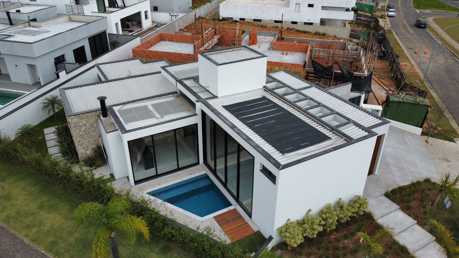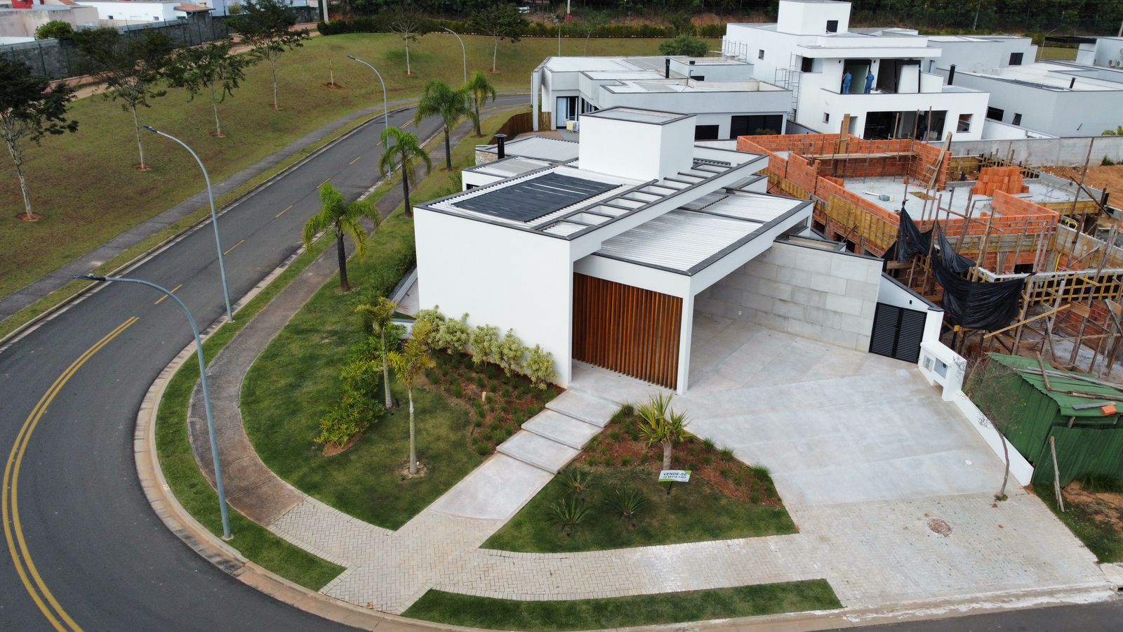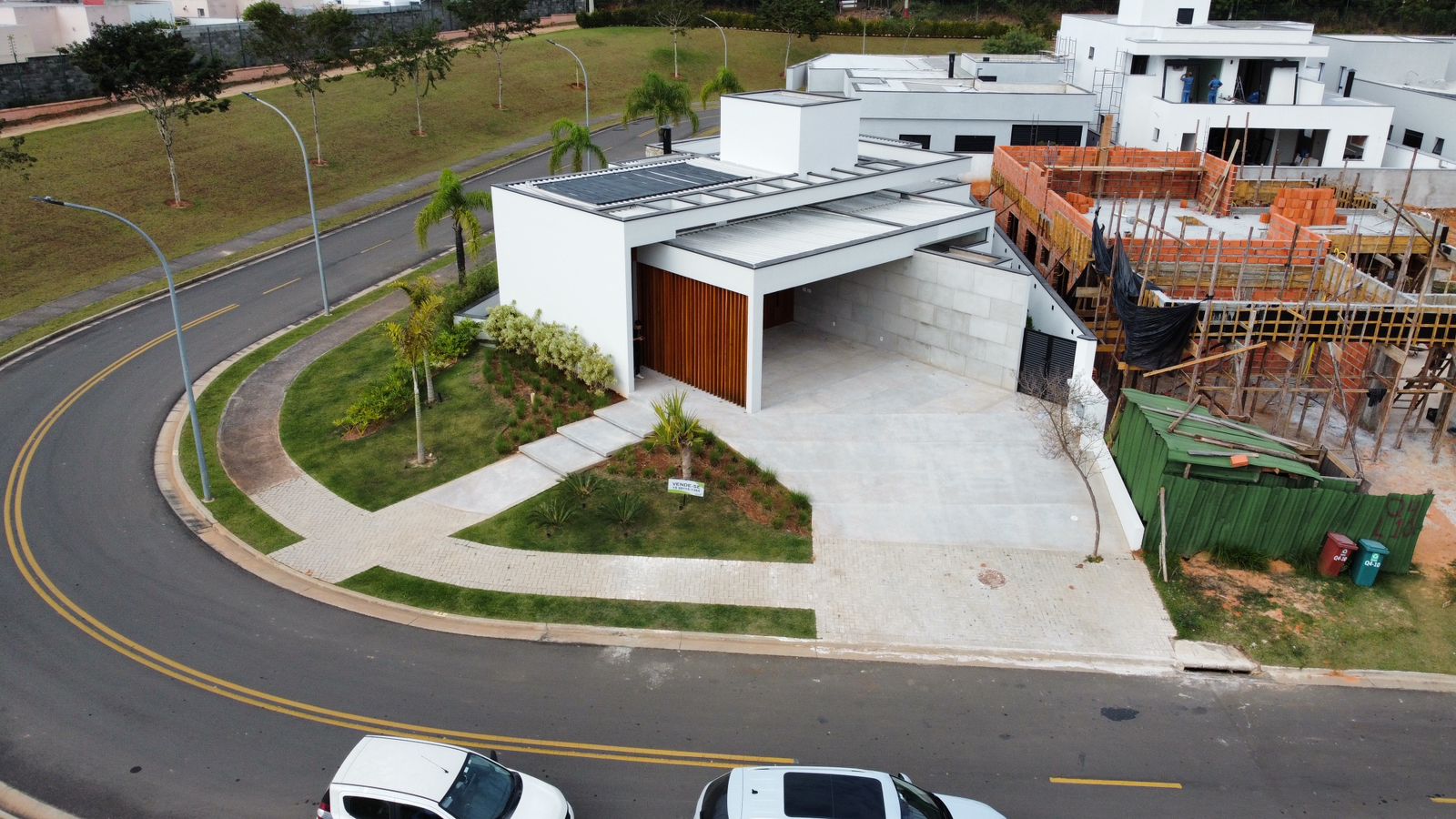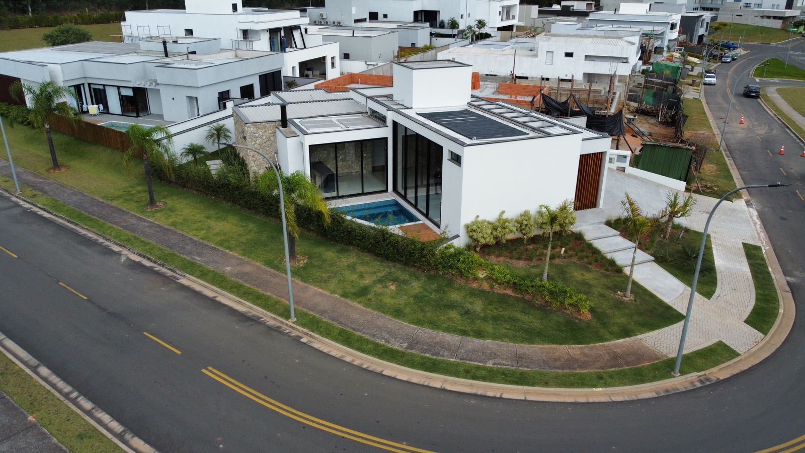 Sala de TV Terreno 485 m2 Sala de Jantar 3 Suítes Corredor Lateral Cozinha com balcão Construção 214,34 m2 Pastilhas no banheiro Entregue com automação Piso porcelanato laminado Vaga para 2 carros cobertos Vaga para 2 carros descobertos
